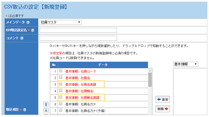 その場合、事前に「CSV取込の設定」で英語情報を取り込むための設定が必要です。