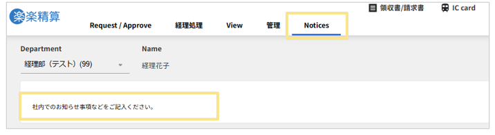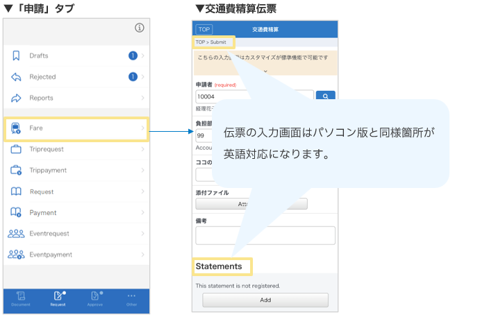 申請画面の項目名など、英語名称に変更できる箇所が日本語で表示されます。