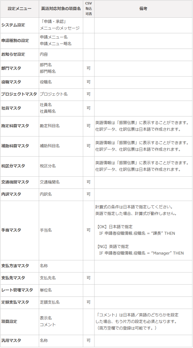 概要 表示言語の切り替え方法 ▶社員マスタ ▶ログイン画面 ▶個人設定 英語対応の対象になる画面 ▶申請画面 ▶「申請・承認」タブ ▶「閲覧」タブ ▶「お知らせ」タブ ▶スマートフォンアプリ ▶スマートフォンブラウザ版 ▶通知メール 英語情報の登録 ▶登録画面 ▶英語対応対象のマスタ ▶CSV取り込み 注意事項 |