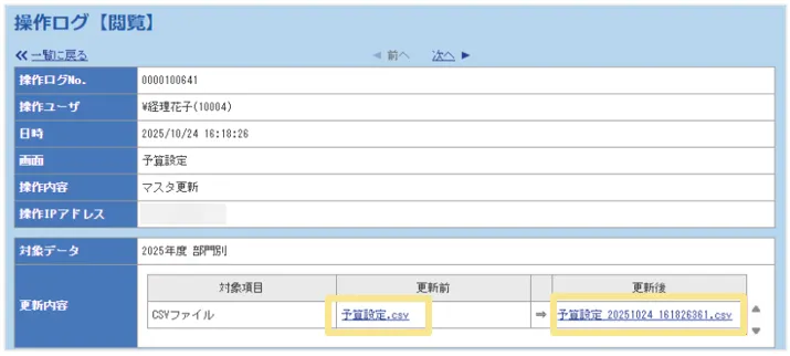これまで、予算設定を更新すると、操作ログに「更新前」「更新後」それぞれのCSVファイルが