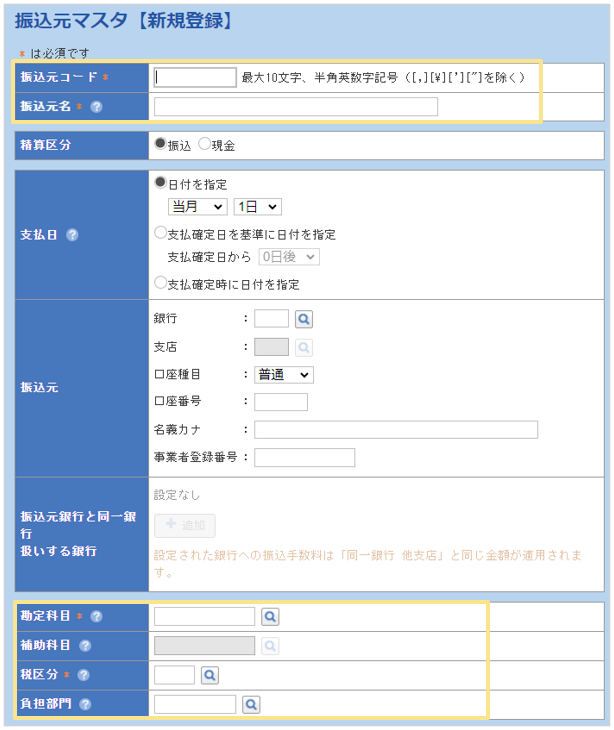 ※「振込元」を選択することで、自動的に支払仕訳の貸方が決定します。 - 振込の場合は、振込元となる金融機関の口座情報を合わせて登録します。
