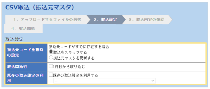 振込元マスタを更新する場合は、一番上の「振込元コード重複時の設定」を