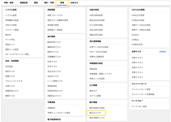 6.「楽楽精算」にログインして「管理」タブをクリックし、「銀行情報」の「振込元マスタ」を