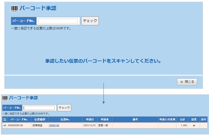 101件以上の伝票をバーコードリーダーで承認したい場合は、