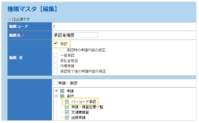 バーコード承認を行うには、「バーコード承認」の権限が必要です。