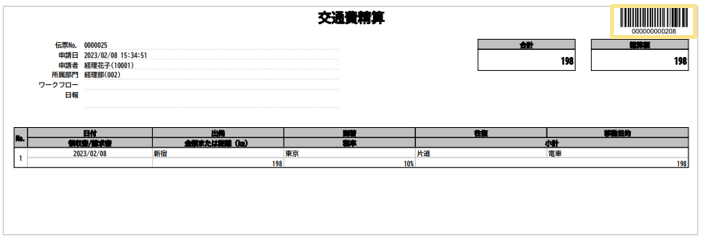 上記の設定で、帳票の右上にバーコードが印字されます。