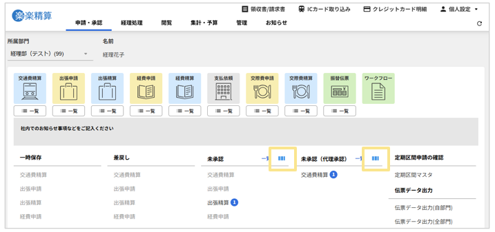 1.「申請・承認」タブ >「未承認」のバーコードのアイコンをクリック