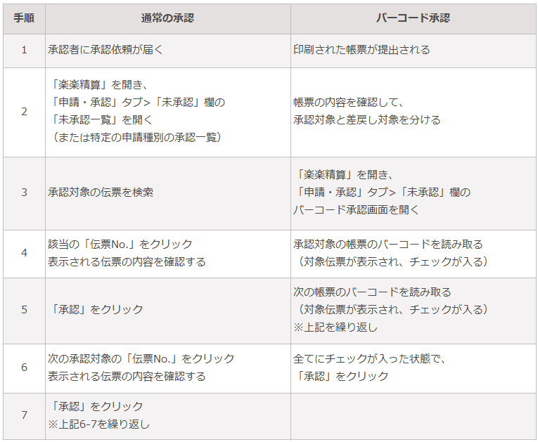 通常の承認とバーコードを利用する場合の処理フローの違いは以下の通りです。