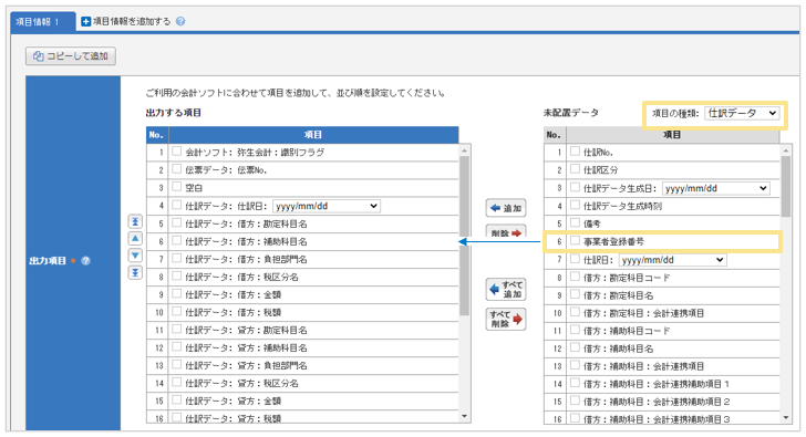 「管理」タブ >「仕訳データ出力の設定」で「出力する項目」に、