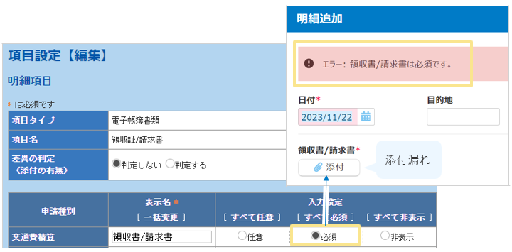 エラー表示(申請ができない状態)になるため、添付漏れ防止になります。