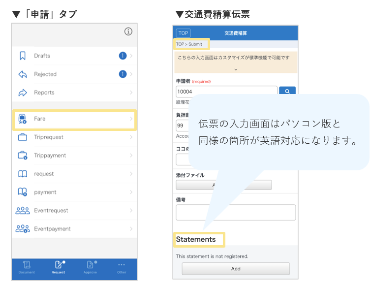 パソコン版と同様の箇所が英語対応となります。 - 「楽楽精算ICリーダー」アプリは「英語対応オプション」の対象外になります。