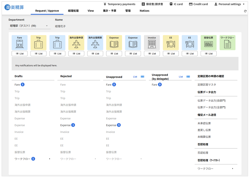 管理者にて英語情報の設定が必要です。 - 「経理処理」タブ、「管理」タブ、「乗換案内」は英語対応の対象外です。