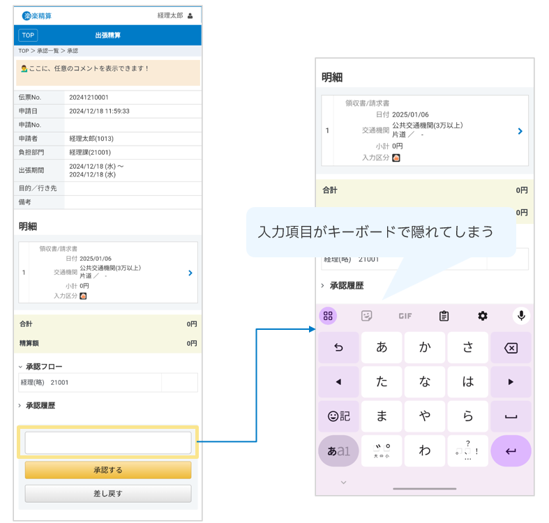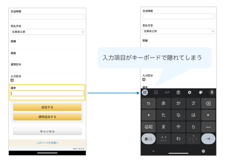 ≪完了≫Android版「楽楽精算」アプリにおいて、 一部画面で画面下部の入力項目がキーボードで隠れる事象について