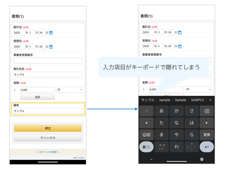 一部画面で画面下部に配置されている入力項目がキーボードによって隠れてしまう事象を