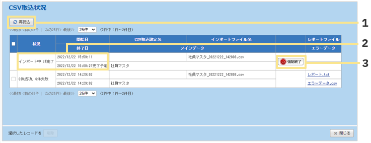 強制終了ボタンをクリックするまでに取り込まれたデータは、取消はされず取込が確定します。