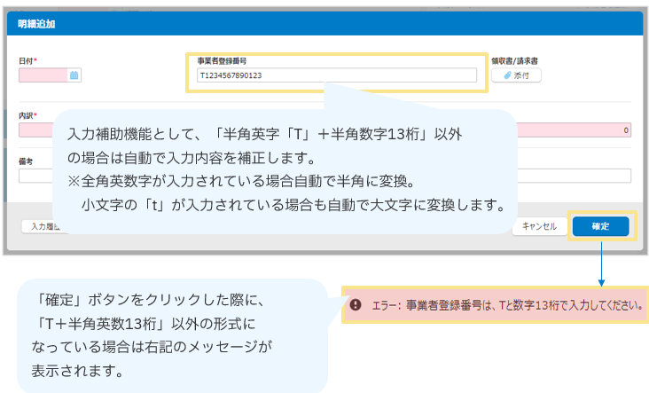 また、「確定」ボタンをクリックした際に「T+半角数字13桁」以外の形式になっている場合は