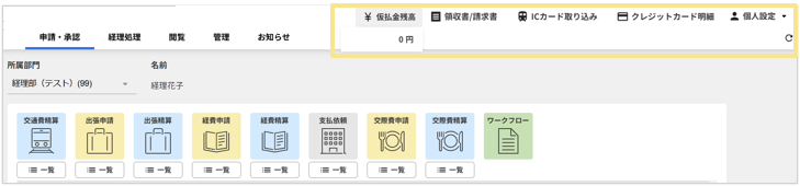 トップ > 画面のメニュー名で調べる > ログイン直後右上 > ログイン直後右上 楽楽精算CS 2023/03/20 09:00 ログイン直後右上 ログイン直後右上に表示されている機能をまとめています。 仮払金残高:〇〇円 ( 仮払金の繰越をする設定の場合、仮払金の残高が表示されます) 領収書/請求書 (「電子帳簿保存法オプション」の機能) ICカード取り込み (「ICカードオプション」の機能) クレジットカード明細 (「クレジットカード連携オプション」の機能) 個人設定 (記事ID:2124) いいね 共有する 共有する リンクをコピー