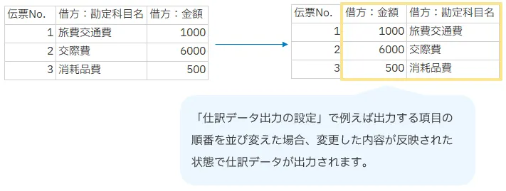 こちらの手順では、「仕訳データ出力の設定」で変更した内容が反映された状態で