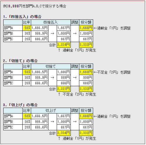 合計金額が正しくなるように最も大きな比率の按分先で調整されます。