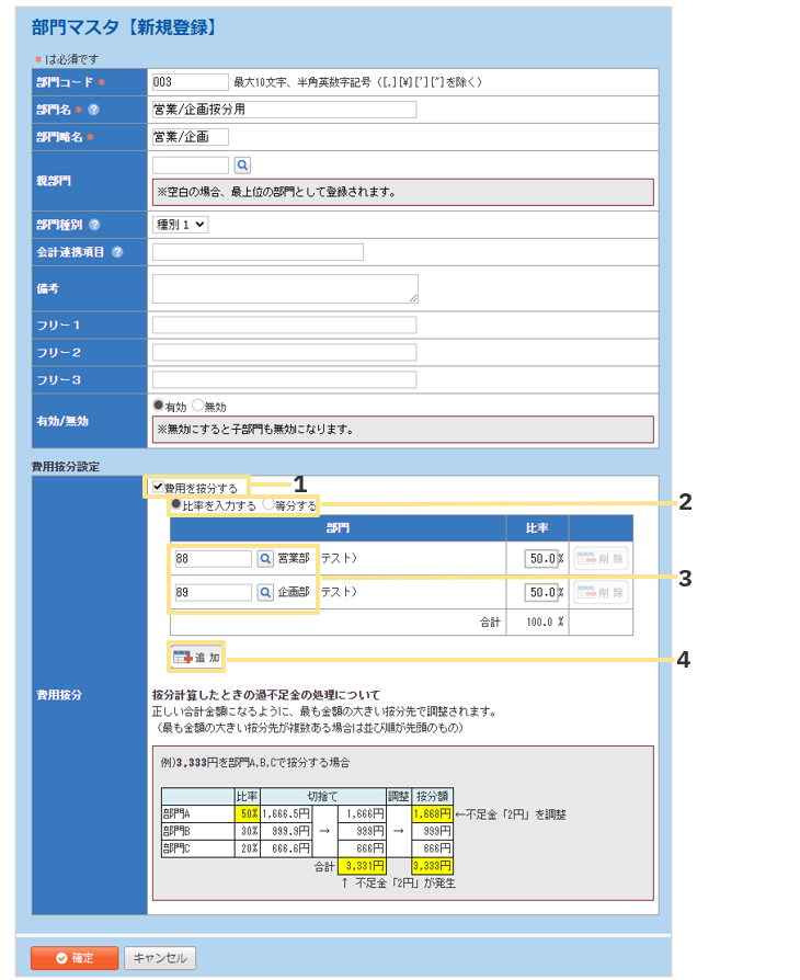 1.比率を入力する/金額を入力する/(選択した部門で)等分する のいずれかを選択できます。