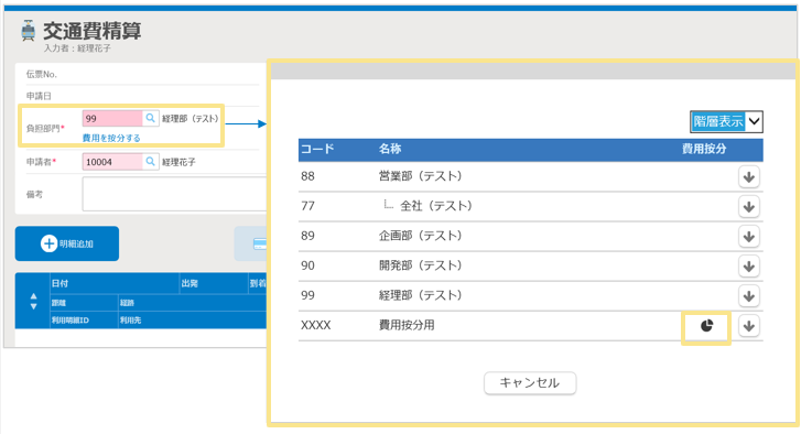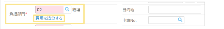 チェックを入れた場合、申請時に按分対象の部門と比率を入力できます。