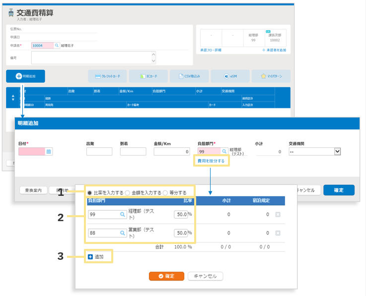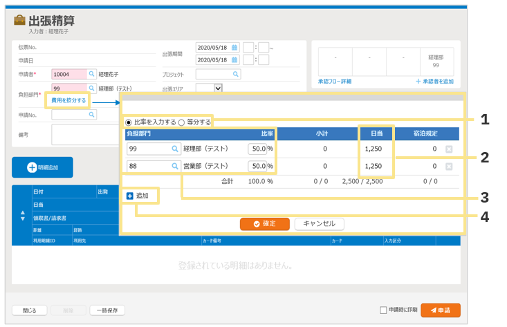 事前に按分対象の部門と比率を登録しておき、申請時にその内容を呼び出して使用する場合には、