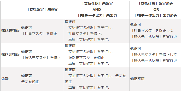 概要 設定手順 ▶「支払確定」未確定 ▶「支払仕訳」未確定 AND「FBデータ出力」未出力 ▶「支払仕訳」確定済み OR「FBデータ出力」出力済み 処理手順 ▶「支払確定」未確定 ▶「支払仕訳」未確定 AND「FBデータ出力」未出力 ▶「支払仕訳」確定済み OR「FBデータ出力」出力済み |