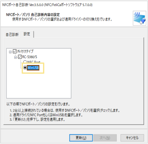 インストールしたのに、「NFCポート/パソリ 自己診断内容の設定」に「WinUSB」が表示されない