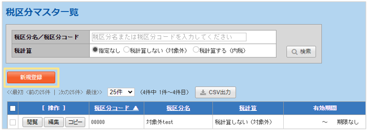 2. 「税区分マスタ」画面左上の「新規登録」をクリック