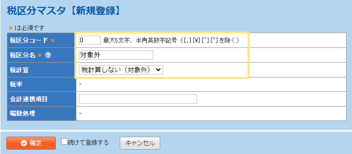 | 税区分コード | 最大半角5文字、半角英数字記号のみ 会計ソフトで利用しているコードを登録して ください。 登録すると、後から修正できません。 ※正しいコードで再度マスタを新規登録し直す ことはできます。 |