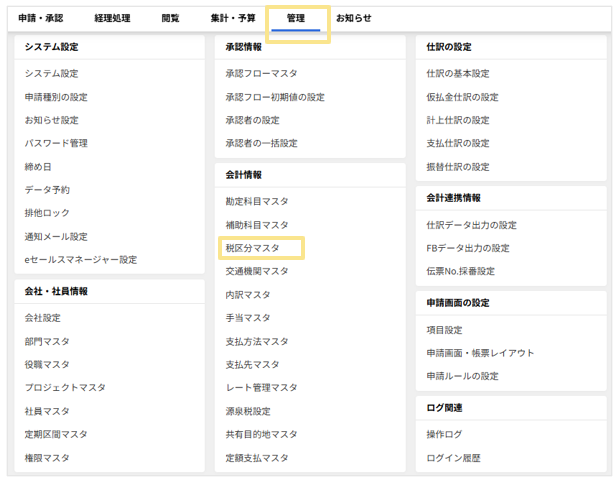 「税区分マスタ」の設定方法は「楽楽精算」の「税区分マスタ」画面からの直接入力のみです。