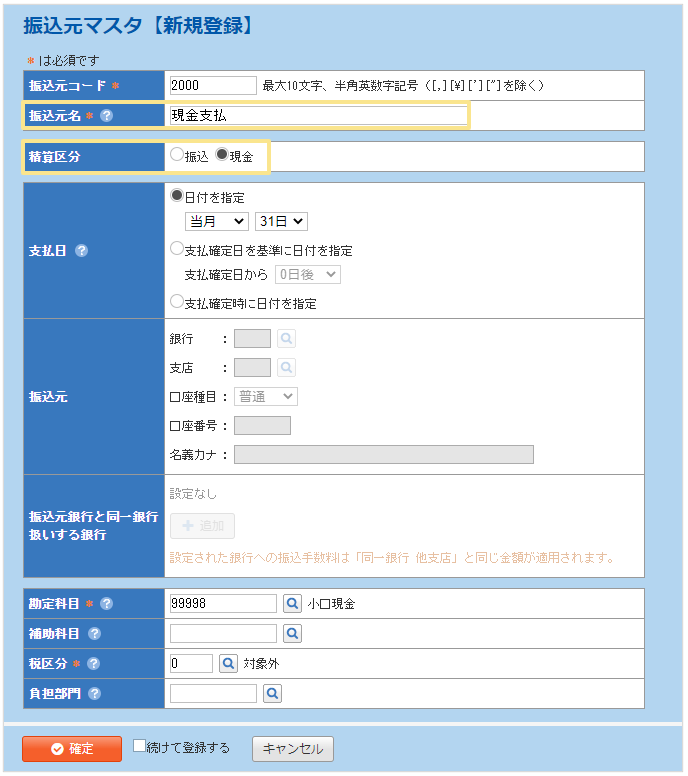 「現金」を選択した場合の 「支払仕訳」の「貸方」にあたる 勘定科目、補助科目、税区分、負担部門を設定 (振込元によって負担部門を固定しない場合は 負担部門は空欄) |