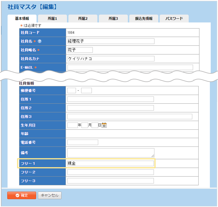 ※表示される入力欄「フリー1~3」は、「社員マスタ」の「フリー1~3」と連動しています。