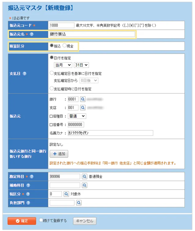 「振込」にあたる振込元と、「現金」にあたる振込元をそれぞれ登録します。
