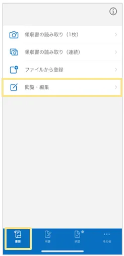 1.「書類」タブ >「閲覧・編集」をタップし、該当の領収書/請求書を選択