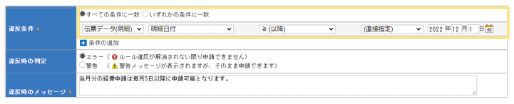 違反条件:「伝票データ(明細)」「明細日付」「≧(以降)」「(直接指定)2022年12月1日」