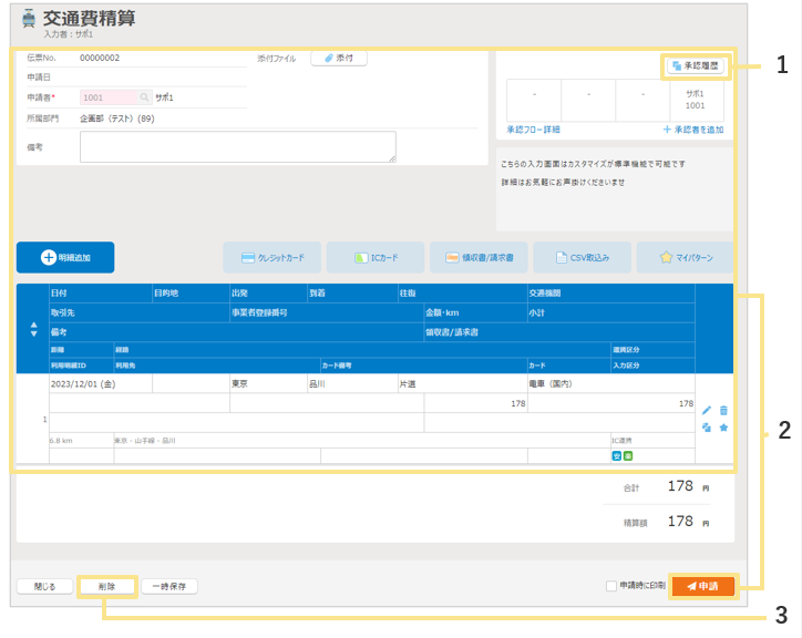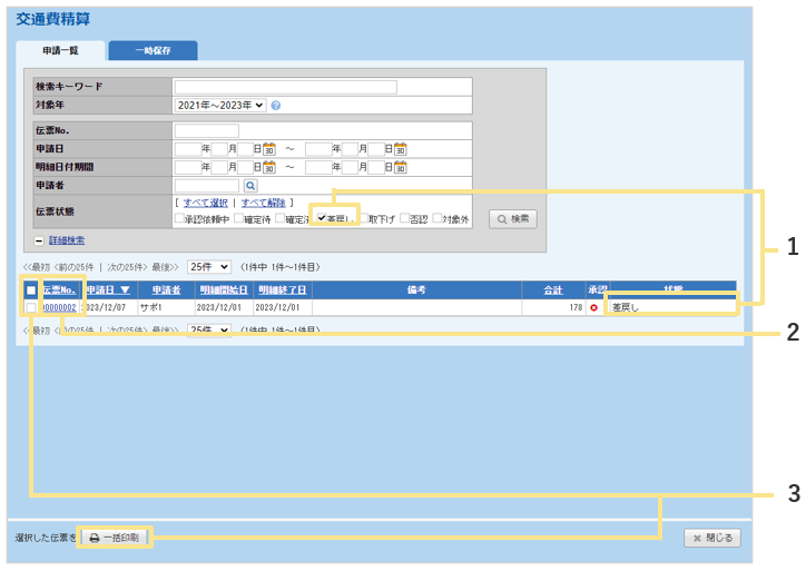 - ログインしているユーザーが過去に申請した伝票のうち、 承認者によって差戻しをされた伝票の