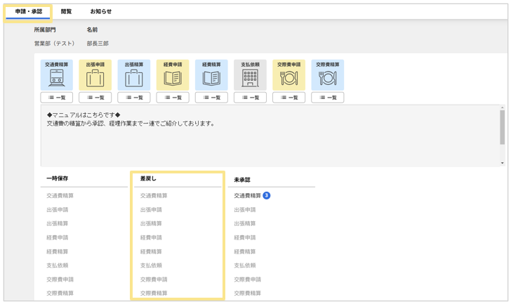 「差戻し」となっている伝票の件数が、申請種別毎に表示されます。