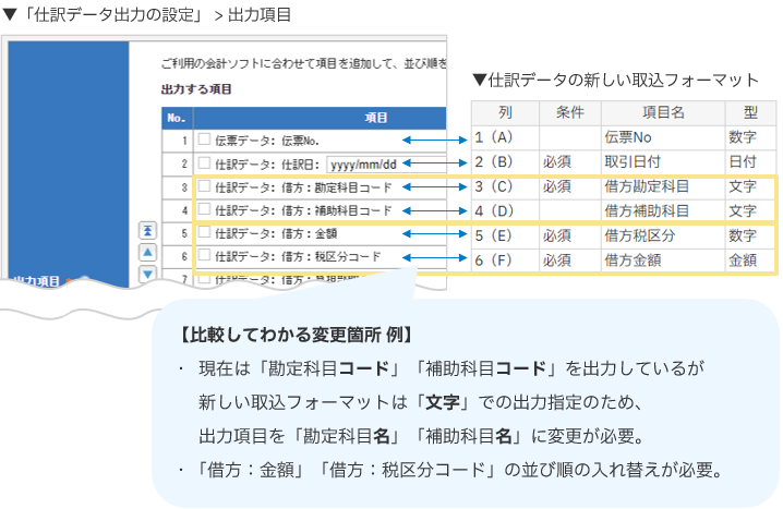 仕訳データの出力項目や項目の並び順など、現状の設定から何を変更する必要があるかを