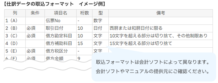 - 取込フォーマットは、会計ソフトのマニュアルの「外部データ取込」「汎用データ受入」ページに