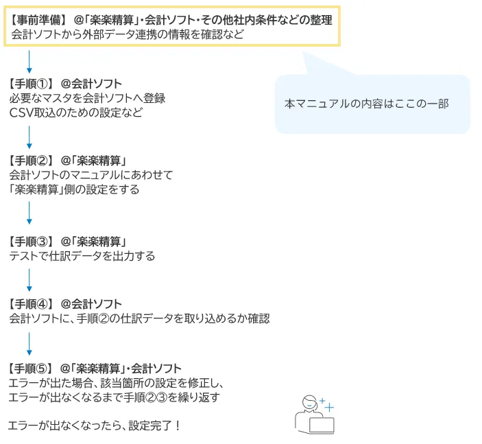 まずは連携する会計ソフトのマニュアル(仕訳データの取込フォーマットがわかるもの)を入手し、