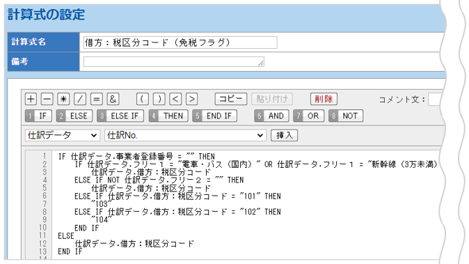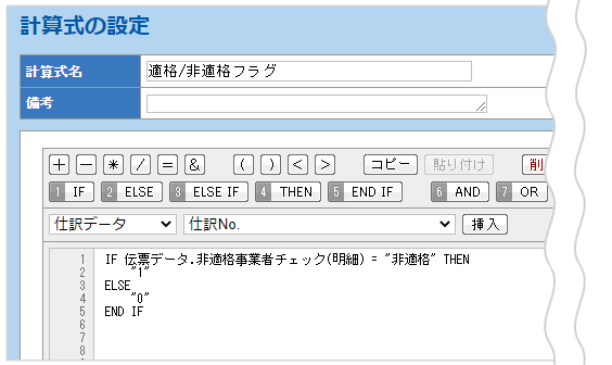 | IF 伝票データ. 非適格事業者チェック(明細)= “非適格” THEN "1" ELSE "0" END IF |