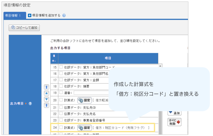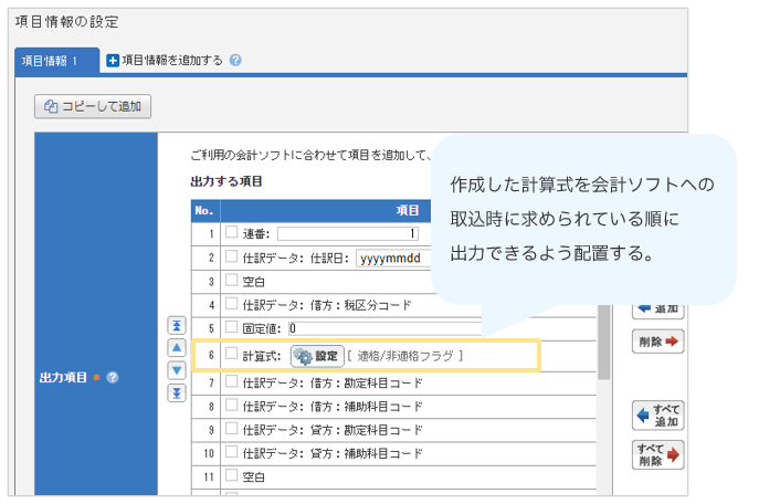 計算式を設定し、「出力項目」にて、会計ソフト側での取込順にあわせて配置する。