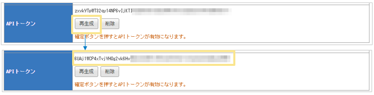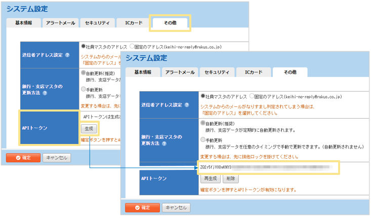 「確定」をクリックすると、再生成後のAPIトークンが「楽楽精算」に登録されます。