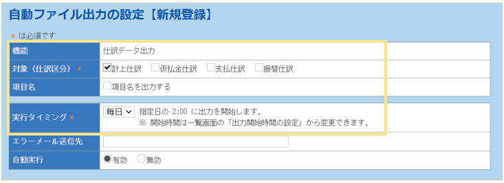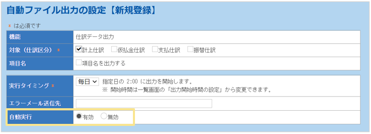 「自動ファイル出力の設定」で設定された頻度(毎日、毎週、毎月)および
