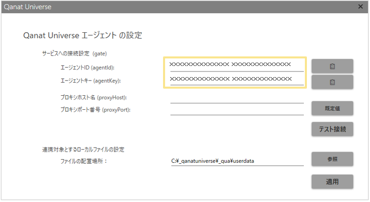 ・AgentKey →「Qanat Universe Agent」に表示される「エージェントキー」を入力