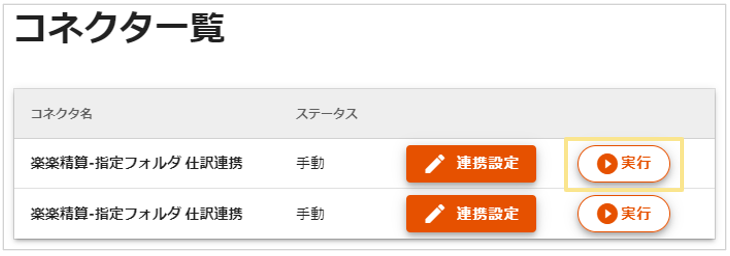 - 「コネクタ一覧」で「楽楽精算-指定フォルダ 仕訳連携」の「実行」ボタンをクリック