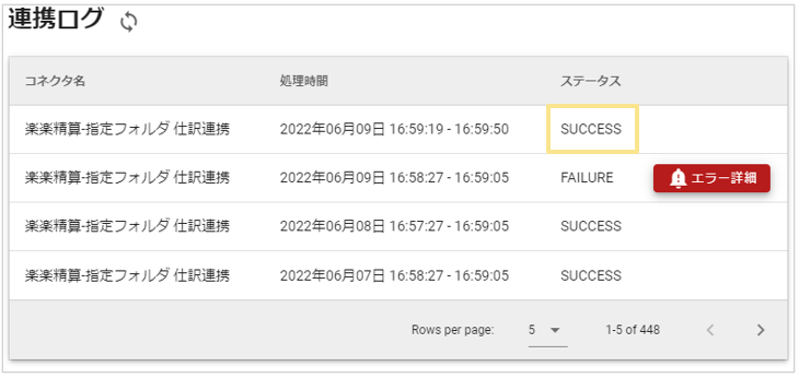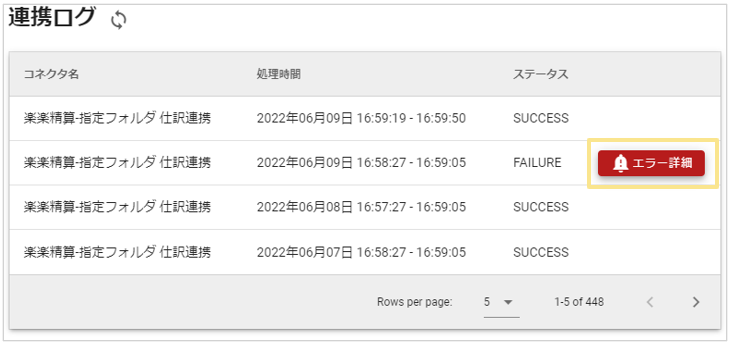 連携エラーがある場合は「コネクタ一覧」の「連携ログ」に「エラー詳細」ボタンが表示されます。