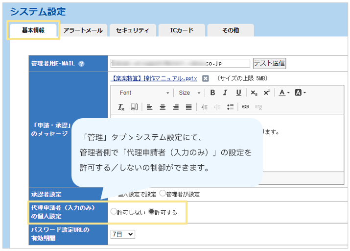 登録できてしまうため、権限を分けた意味がない…。 - 代理申請者の設定はすべて管理者側で制御できるようにしたい!