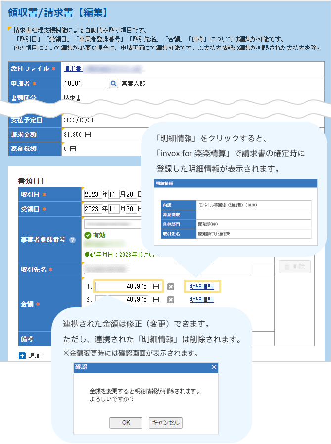 そのため、連携後に「invox for 楽楽精算」側でデータを手修正できません。